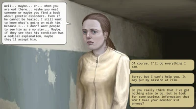The mission can be received at Your Bunker by speaking to Emilia. You'll then need to ask anyone who knows medicine or religion about it. You'll learn that it's a demon from the priest in Orth and that you'll need to speak to a Jacob Fulier, Ex-Demon hunter at Confusion. He'll give you a ritual axe to use to kill the demon. If you go back to your bunker with Olaf, the baby will already be killed and you can either bury it or bring it to Jacob Fulier. Burying it will give you reputation while giving it to Jacob Fulier will get you 10,000.00 money. Going back immediately after talking to Jacob fuller will result in Chairman Brass not believing the baby is a demon, and you will be unable to progress in the mission until you find Olaf.